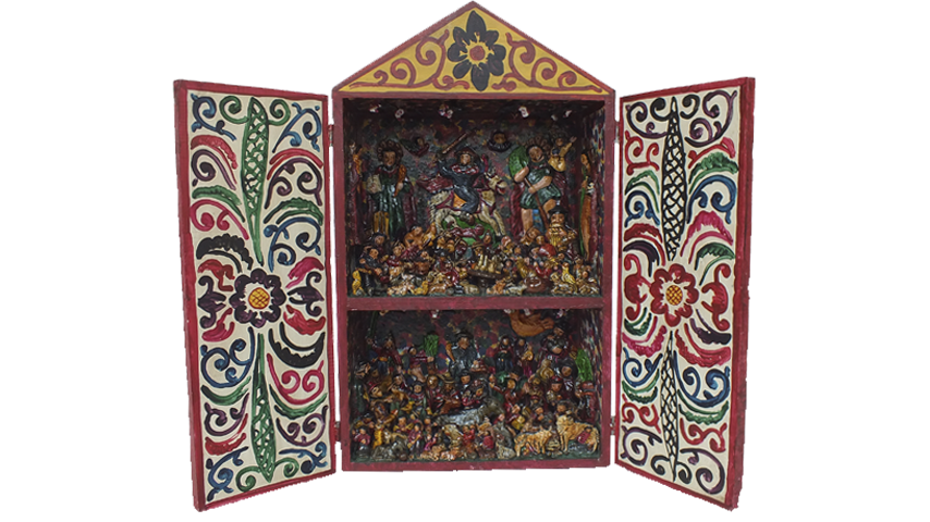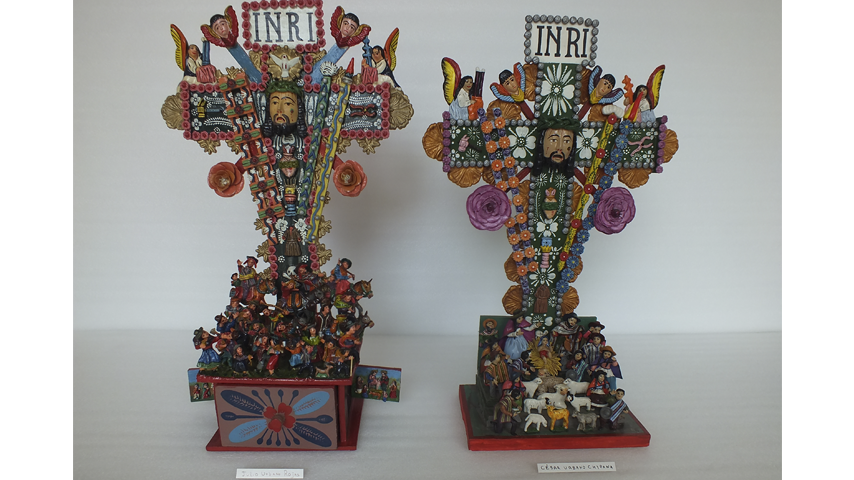 Junto a ella está el reconocido maestro ayacuchano César Urbano, quien practica el arte del Retablo ayacuchano desde los nueve años y estudió en la Escuela Particular de Artesanía, fundada por su padre Julio y su tío, Jesús Urbano. Ahora, esos conocimientos y amor por las costumbres se transmiten a miembros más jóvenes de su familia.