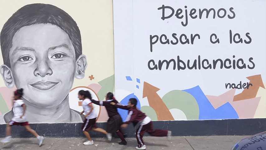 Muro con mensajes sobre seguridad vial en San Isidro.