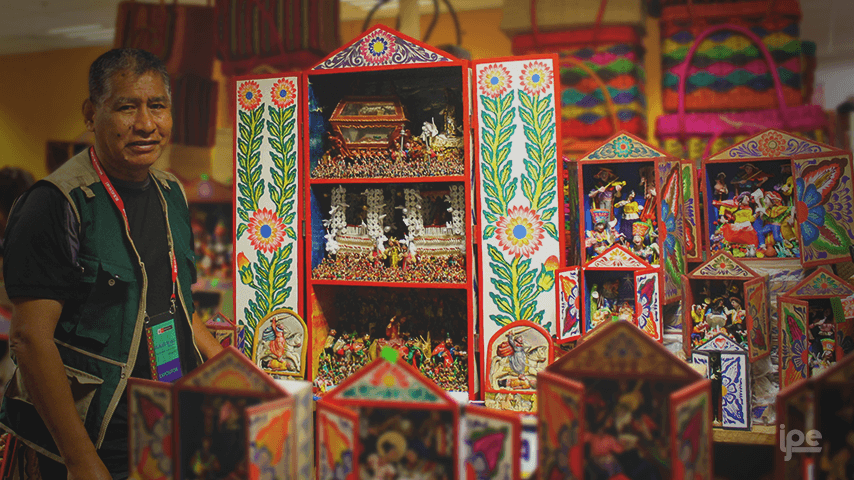 “Aprendí el arte de la imaginería gracias a mi padre. Él me enseñó las técnicas y las formas de los retablos. Hoy sigo su legado. Junto a mi familia elaboramos este arte tradicional. Gracias a la imaginería he podido viajar a diferentes países. Nuestros retablos se caracterizan por la representación jerárquica, en mayor tamaño los personajes relevantes y el pueblo en miniatura extrema” (Jesús Urbano Cárdenas, Ayacucho)