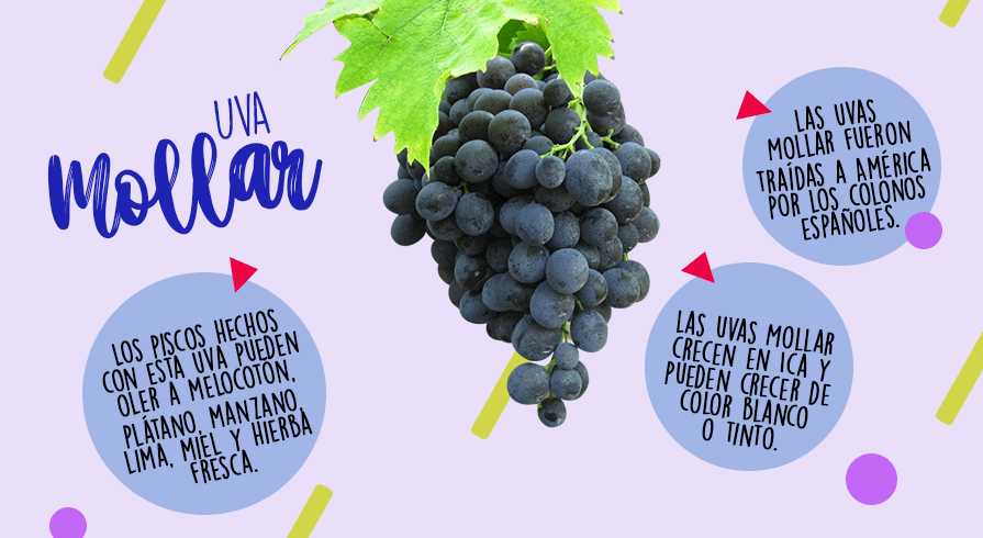 3. Mollar Las uvas Mollar fueron traídas a América por los colonos españoles. Los piscos hechos con esta uva pueden oler a melocotón, plátano, manzano, lima, miel y hierba fresca. Las uvas Mollar crecen en Ica y pueden crecer de color blanco o tinto.