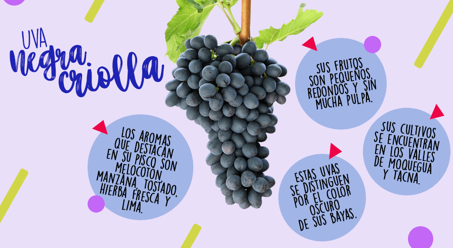 5. Negra Criolla Estas uvas se distinguen por el color oscuro de sus bayas. Sus cultivos se encuentran en los valles de Moquegua y Tacna. Sus frutos son pequeños, redondos y sin mucha pulpa. Los aromas que destacan en el pisco hecho con uva negra criolla son melocotón, manzana, tostado, hierba fresca y lima.