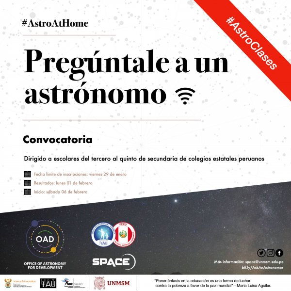 Te contamos que el Seminario Permanente de Astronomía y Ciencia Espaciales (SPACE) de la Facultad de Ciencias Físicas de la Universidad Nacional Mayor de San Marcos (UNMSM), a través de su proyecto ‘Pregúntale a un astrónomo’, ha abierto una convocatoria a nivel nacional dirigida a escolares de tercero a quinto de secundaria de colegios nacionales.